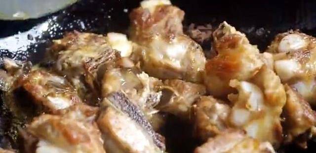 5、另外起鍋,鍋中放入適量的油,油熱後將瀝幹水份的排骨放入鍋中進行炸,不斷的翻炒,炸至排骨微黃後撈出來備用;
