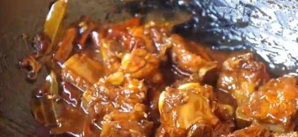6、鍋中留底油,將生薑與幹辣椒放入鍋中爆香,再把八角香葉等配料放入鍋中炸香,而後將適量的冰糖放入鍋中,不斷的翻炒直到差不多融化,然後放入適量的生抽與老抽、耗油,翻炒均勻後倒入一瓶啤酒在鍋中;
