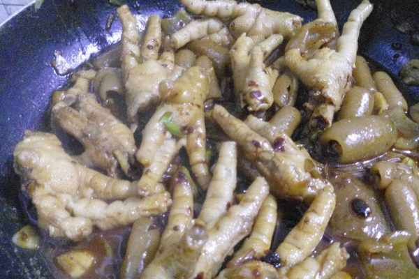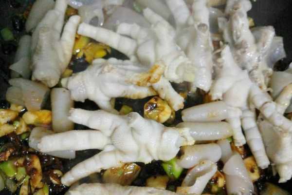 下入雞爪、豬皮,翻炒一下,讓雞爪、豬皮裹上醬汁。