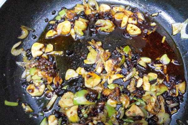 爆香蔥蒜之後,加入生抽、辣醬,煸炒出香味。