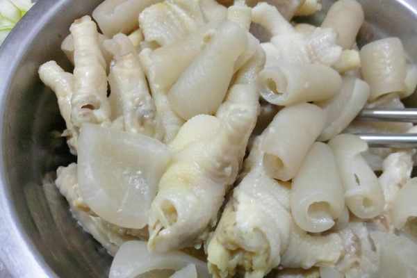 這就是原料,豬皮、雞爪,可能你會說瞭,小編你這是騙人,這怎麼能說是下腳料呢,小編在這裡解釋一下,這是小編做皮凍剩下的,因為熬皮凍後,雞爪、豬皮都已經軟爛瞭,也沒有什麼味道,放到皮凍裡吃起來也不方便,所以小編就二次加工瞭一下,這的確就是下腳料。