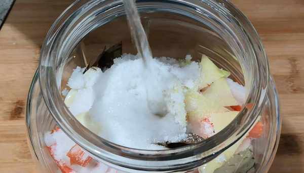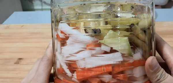 最後燒開的水晾涼後放入罐子中,沒過蘿卜條就可以瞭,蘿卜本身也要出水的