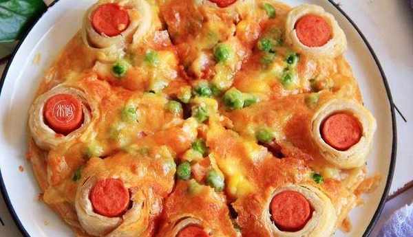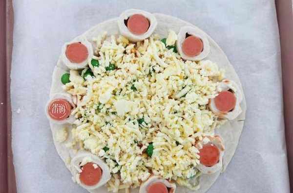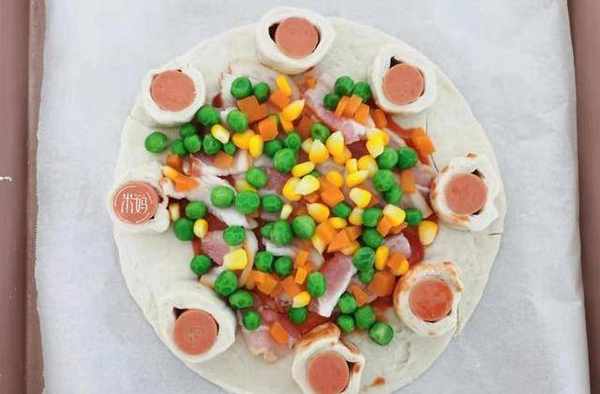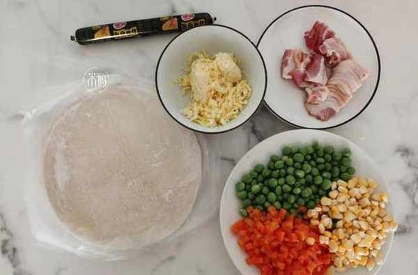 食材:2張手抓餅,培根少許,芝士適量,火腿腸1根,番茄醬 適量,青豆,玉米,胡蘿卜適量