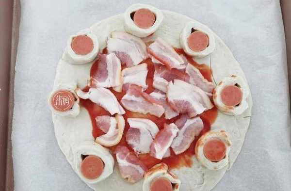 5、接著放上培根肉,也可以放上自己喜歡吃的牛肉,蝦仁,蟹棒等食材。