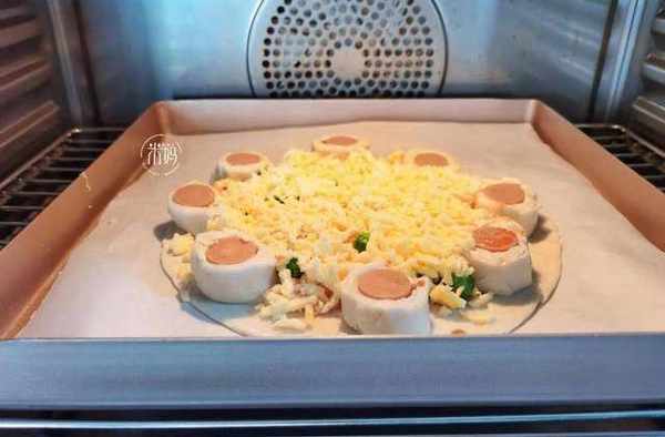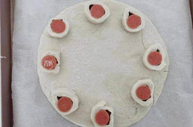 3、取另一張手抓餅,放在烘焙紙上,再把切好的手抓餅火腿腸,繞著手抓餅邊緣繞一圈。