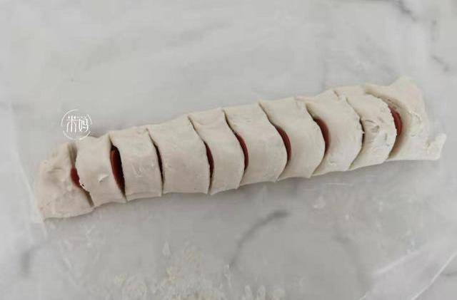 2、火腿腸去掉外面一層包裝,把它放入手抓餅上,用手卷起來,再把卷好的手抓餅切切斷。