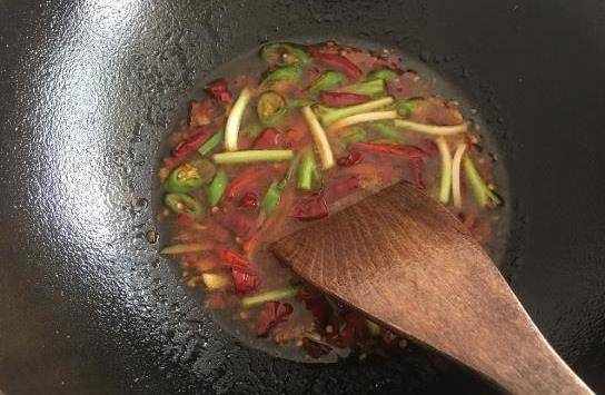 倒入青紅椒翻炒,把調好的汁倒入鍋內,炒勻,放入蔥段。