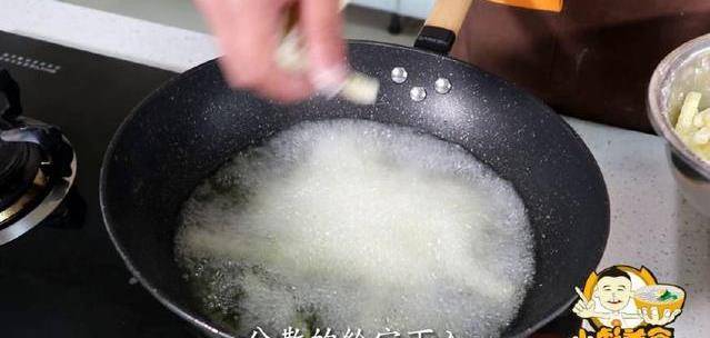10、拍好淀粉,油溫基本燒至五成熱瞭、下入薯條、看上去一下入冒泡這時候油溫就好瞭。