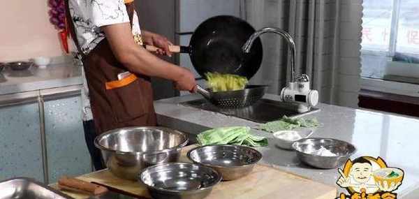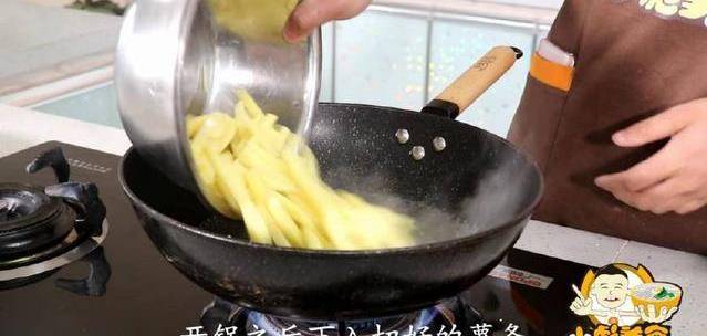 6、另起鍋我們倒入一碗的水、給它大火燒開、開鍋之後下入切好的薯條.