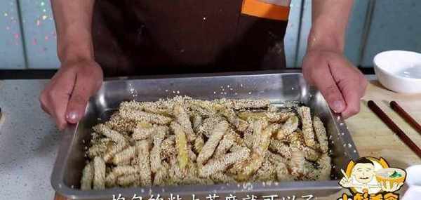 17、讓薯條均勻的粘上芝麻、擺入一個小點的盤中。