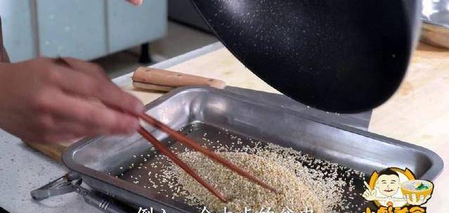 5、炒的這芝麻微微發黃就可以、看上去芝麻有點變鼓瞭的感覺、倒入一個大點的盆中。