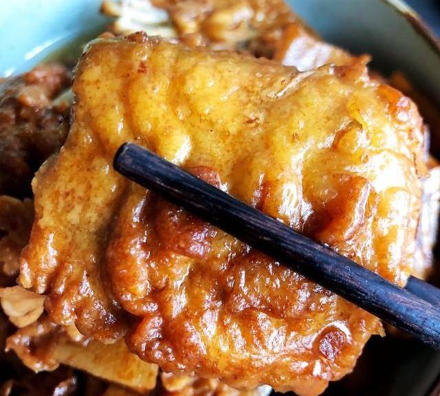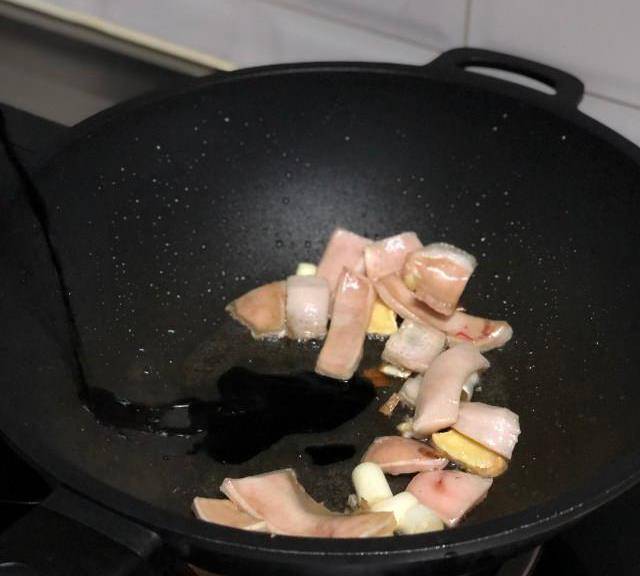 第4步、4.放入切塊後的豬皮翻炒一下(不喜歡吃豬皮可以不放),加入味極鮮醬油及紅燒醬油,醬油經過油炸後馬上飄出香味兒。