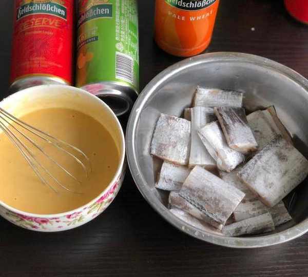 原料:帶魚、油、味極鮮、紅燒醬油、啤酒、料酒、醋、蒜、蔥段、薑、清水、雞蛋、面粉、鹽、豬皮。