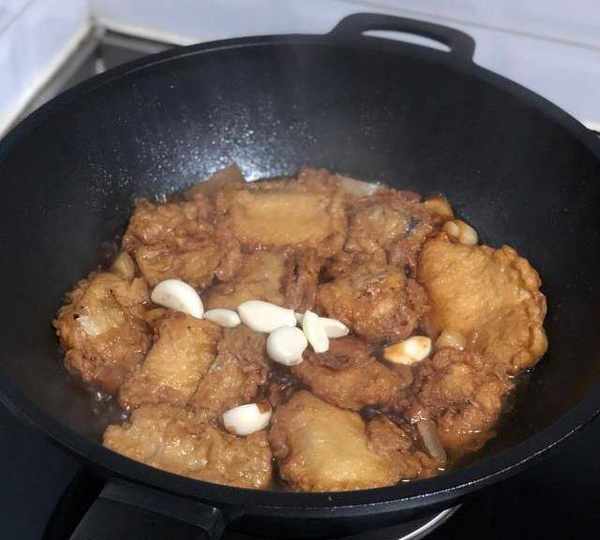 第7步、7.加入蒜瓣,此時湯汁已經收掉一半瞭,如果覺得湯不夠,此時可以加少許水,個人很喜歡吃熟蒜,所以加的比較多,如果不喜歡吃也可以不加或者少加。