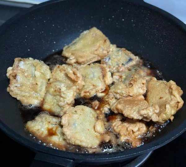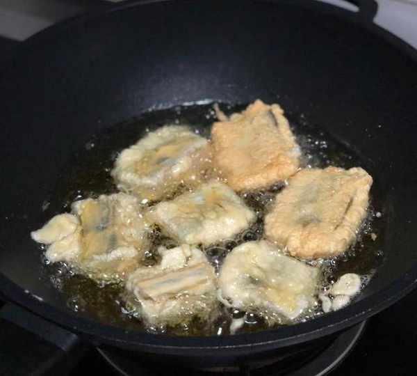 第2步、2.帶魚從料酒中取出後直接裹面糊,鍋中倒入較多食用油,油溫5成熱轉中火,將帶魚下鍋炸,並不時翻面,炸至表面金黃撈出控油備用註意:面糊越稠,裹在帶魚上就越厚,所以面糊的濃稠程度可以根據自己的口味來決定。