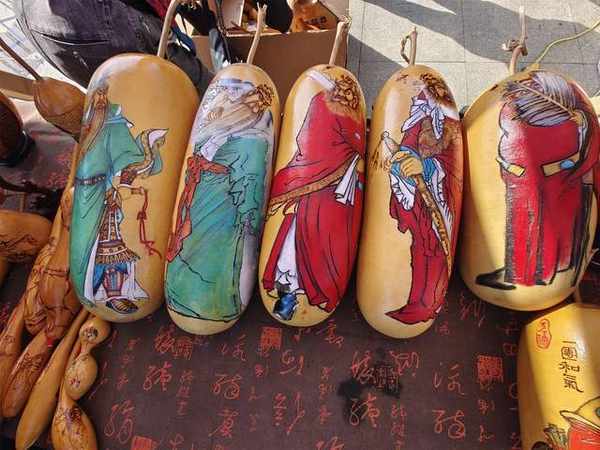 “ 烙畫葫蘆大小不一、色彩艷麗。每一個葫蘆上畫著表情自然、神態各異的人物。個個花鳥栩栩如生,讓人十分驚嘆。葫蘆烙畫用電烙鐵加熱代替毛筆,運用雕刻、烙畫等技法,把傳統繪畫、書法、圖案在立體的葫蘆上表現出來。