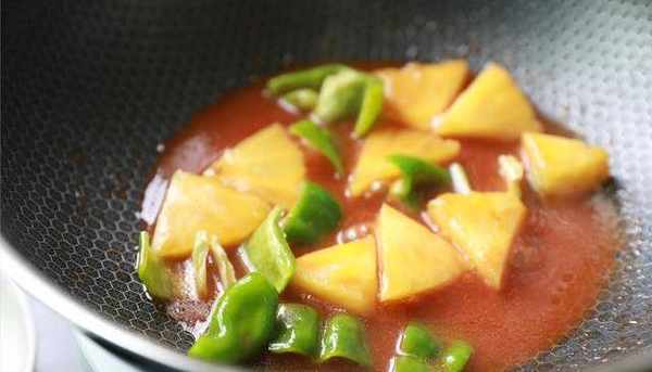 8.鍋內加入適量色拉油,加入菠蘿,翻炒至帶點金黃色。