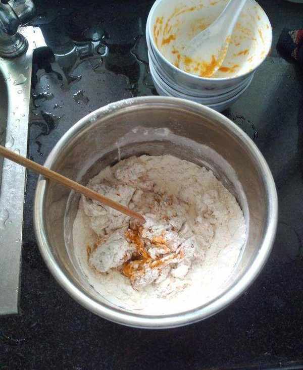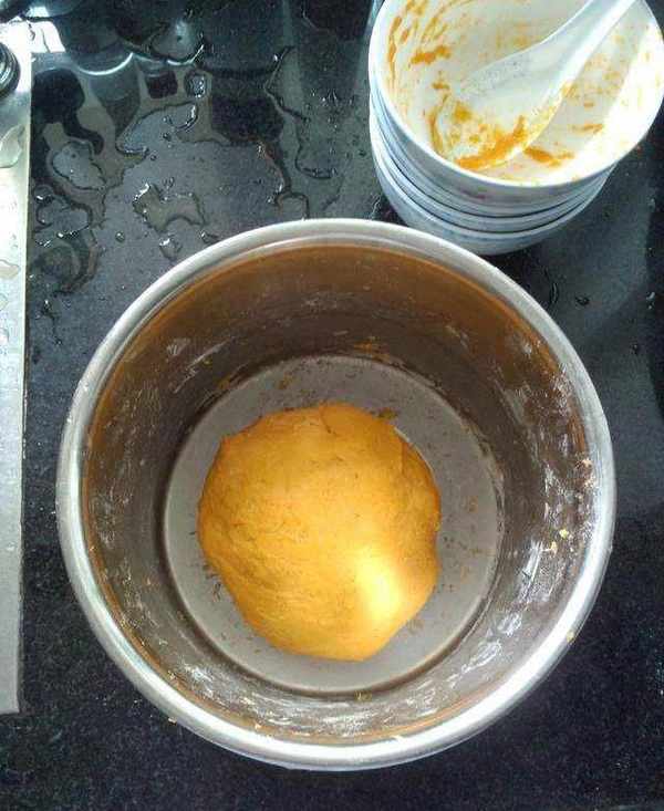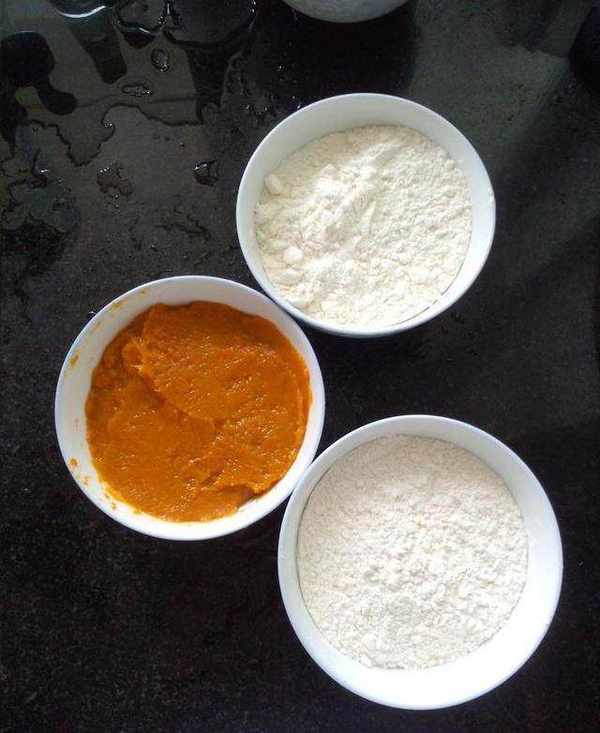 面粉、南瓜泥、白糖、酵母溶液混合均勻。