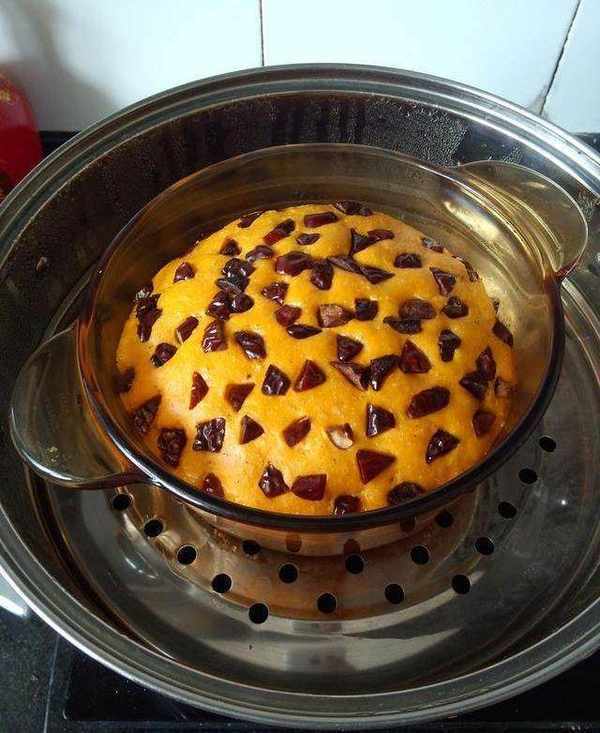 出鍋的發糕因為放瞭大量的南瓜而變得金燦燦的,上面還有一層紅棗,非常好吃。