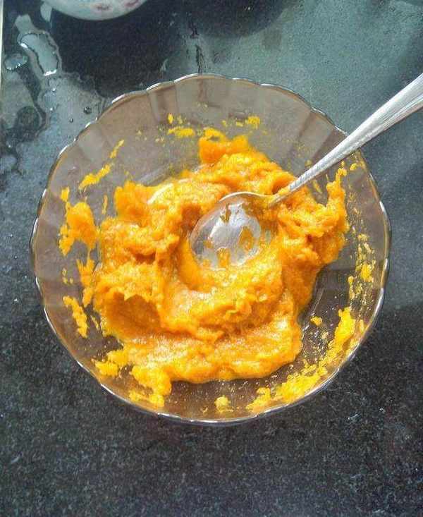 制作南瓜泥:南瓜上鍋蒸熟後放涼,然後用勺子壓成南瓜泥。