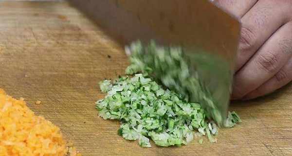 第一步:南瓜半個,去皮後用勺子挖去瓜瓤,切成薄片後裝進盤子。上鍋蒸至南瓜軟爛後關火取出(大約蒸瞭15分鐘);胡蘿卜和黃瓜切成碎丁,放入大碗中備用