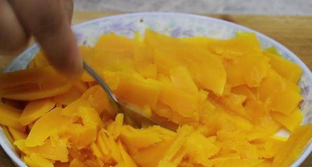 第二步:倒出南瓜中多餘的水分,用勺子把南瓜壓成泥,盡量壓細膩一點