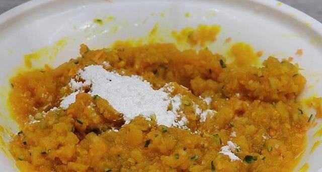 第三步:把搗好的南瓜泥倒入裝有胡蘿卜黃瓜碎丁的碗中,攪拌均勻後加入少許玉米淀粉和面粉,再次拌勻後繼續加入少許鹽和雞精(不喜歡可以不放)調味