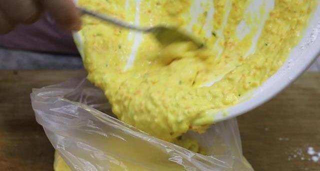 第四步:準備一個保鮮袋(或者是裱花袋),把調好的面糊倒進來,袋口打結,然後切去保鮮袋的一個角備用