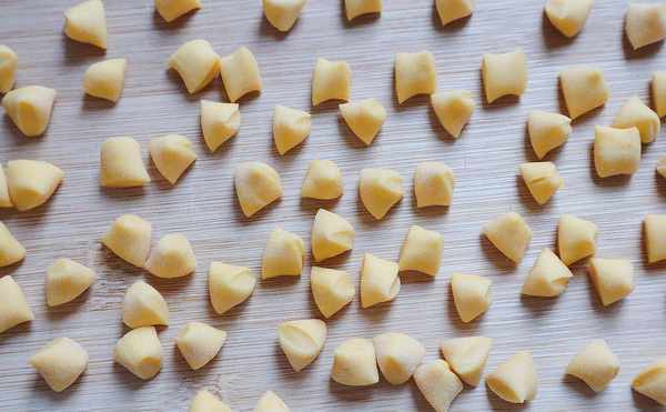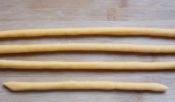 5、把切好的長條逐根用手揉搓成圓柱形,然後像做餃子皮一樣切成大小均勻的小面劑,個頭的大小基本上跟我們在外面買的小饅頭差不多,隻不過形狀補一樣。切好後可以撒上一點幹面粉,防止粘連。