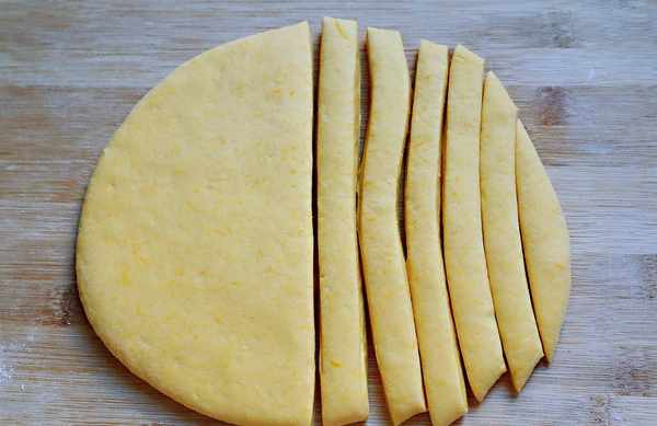 4、案板上撒上少許幹面粉,把發酵好的面團放在案板上揉搓排氣,然後用手壓扁,搟成一個厚度約為0.5厘米左右的面片,然後用刀切成寬度約1厘米左右的長條。