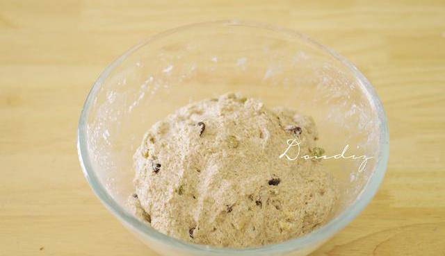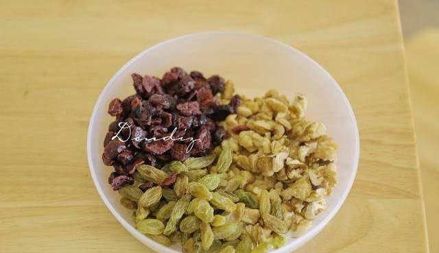 3、所需要的堅果根據個人的口味進行調整,我所用的是蔓越莓、葡萄幹及核桃仁碎。