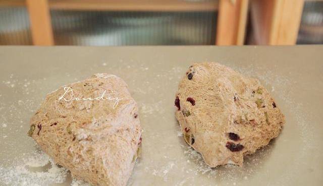 配方:高筋面粉150克、全麥粉450克、海鹽4克、酵母粉4克、水500克、蔓越莓80克、葡萄幹80克、核桃仁150克