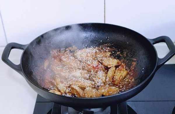 5、按個人口味加入鹽。大火收湯,加入白芝麻,翻炒均勻即可出鍋。
