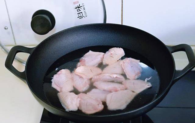 2、將雞翅焯水,冷水入鍋,大火燒開,煮2分鐘,撈出,用溫水將雞翅上的雜質沖洗幹凈,淋幹水分備用。