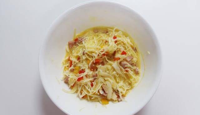 1.首先火腿、甜椒、切成小丁備用,大頭菜切絲備用(或者生菜切片)。蔬菜可以根據自己的喜好做些調整,比如:胡蘿卜、洋蔥、西紅柿、蔥等等。