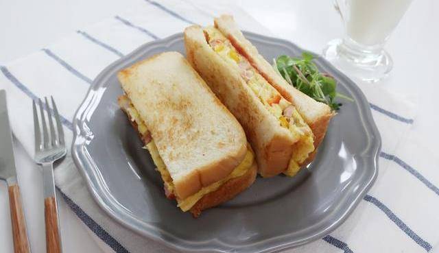 7.把另外一片面包放上去,用刀切一半,這《雞蛋土司》就完成瞭。簡單易學!
