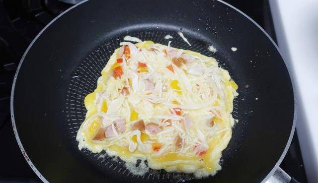 5.烤面包的時候,在鍋中大概比量一下面包的大小,然後把攪拌好的雞蛋液煎成餅,註意要用鍋鏟做出正方形,要和面包尺寸差不多一致才行。這個需要點技術哦。因為有4片面包,所以我們需要煎兩個雞蛋餅。