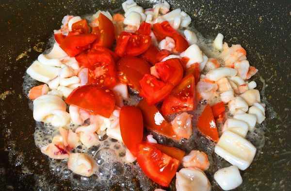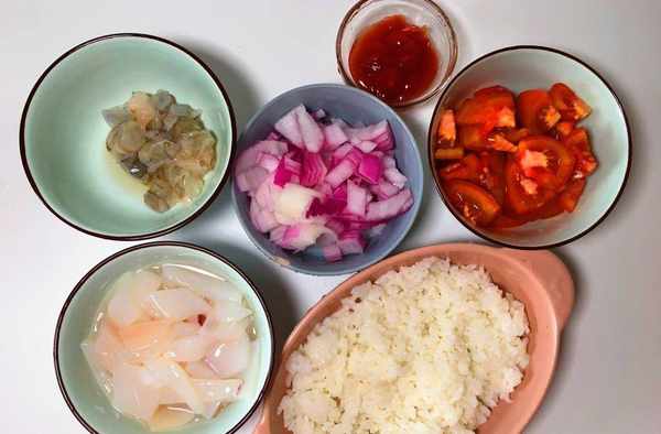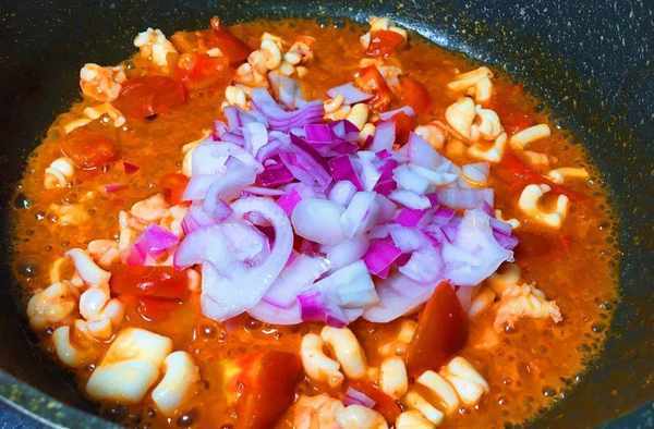 食材:蝦仁50克、洋蔥100克、蕃茄2個、蕃茄醬適量、鮮魷魚、米飯一份