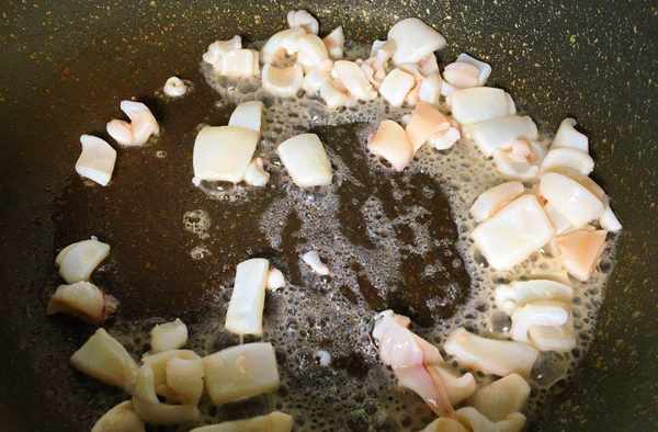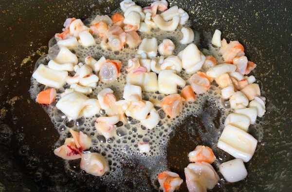 第一步:熱鍋倒食用油,放鮮魷魚翻炒 大概炒1分鐘