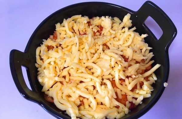 第六步:鋪上碎馬蘇裡拉 烤箱預熱好、上下溫度200度左右,烤20分鐘,表面微黃即可。根據個人口味