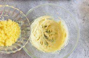 4.過篩後的蛋黃細膩且顆粒均勻,加入打發的黃油中,用刮刀翻拌均勻