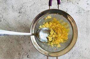 3.將煮熟的雞蛋黃提前從雞蛋中剝出來,外表晾幹一些,過篩備用
