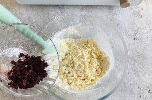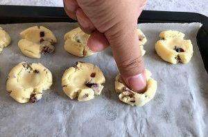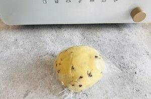 用料:低筋面粉100克,玉米淀粉100克,黃油100克,鹽1克,熟蛋黃2個,糖分20克,蔓越莓幹25克(葡萄幹也可以)