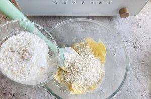 5.加入低筋面粉及鹽,玉米淀粉,用刮刀混合均勻