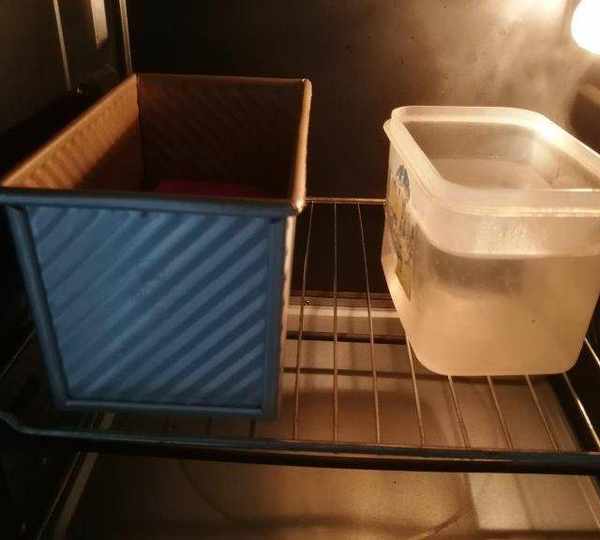 第13步、放到烤箱中二次發酵,旁邊放一盆熱水。