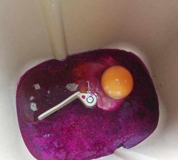 第2步、火龍果汁、雞蛋、米糠油放在面包機內膽中,糖和鹽放在對角。