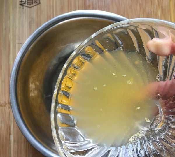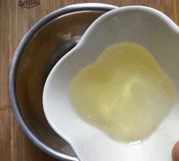 2,有蛋黃的盆裡倒入25克橙汁(其他果汁或者水也可以),25克植物油。(植物油最好是調和油、玉米油、葵花籽油等氣味小的油,不要花生油、菜籽油等)