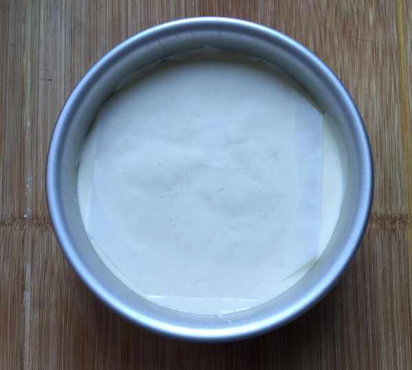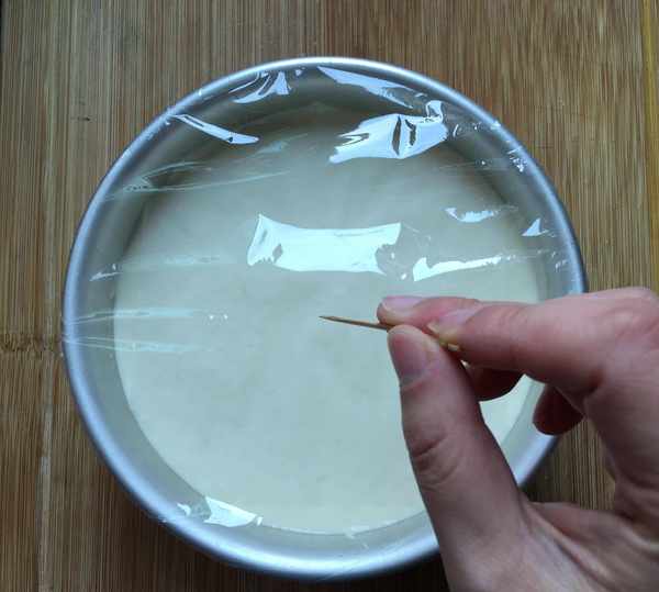 6,蛋糕糊翻拌好後,倒入模具,蛋糕糊上貼一張料理紙(用剪刀剪成需要的大小),再給模具裹上保鮮膜,在上邊用牙簽紮幾個孔。(也可以不用料理紙和保鮮膜,直接在模具上蓋個盤子也行)