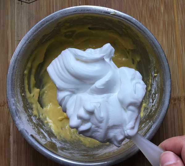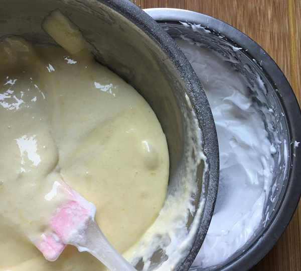 5,取1/3蛋白霜倒入蛋黃面糊,畫之字翻拌均勻後,再將所有蛋黃面糊倒入蛋白霜,快速翻拌均勻。