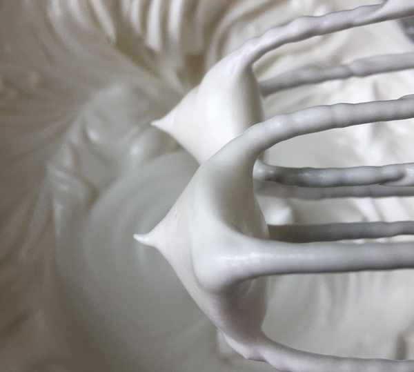 再打到有細膩泡沫時再加入1/3白糖,蛋白打到有彎鉤時加入最後1/3白糖,直到蛋白打發到提起打蛋器有直立尖角就好瞭。
